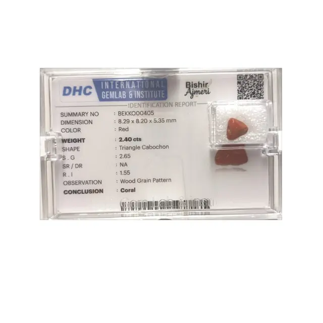 A genuine Natural Red Coral (Moonga) weighing 2.40 carats, certified by DHC International Gemlab & Institute (Report No: BEKK000405).
